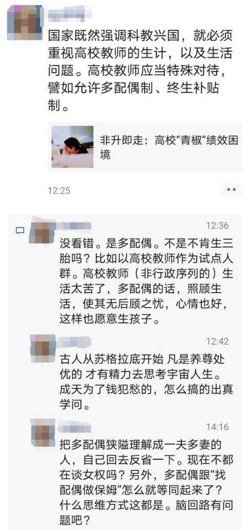 以上言论阔以看出,此位受过高等教育的大学教师妄想以国家计划生育为由,获取多配偶和终生补贴的待遇,从某种角度上来讲该教师虽然是高校教师但是非健康思维太过于恶劣。